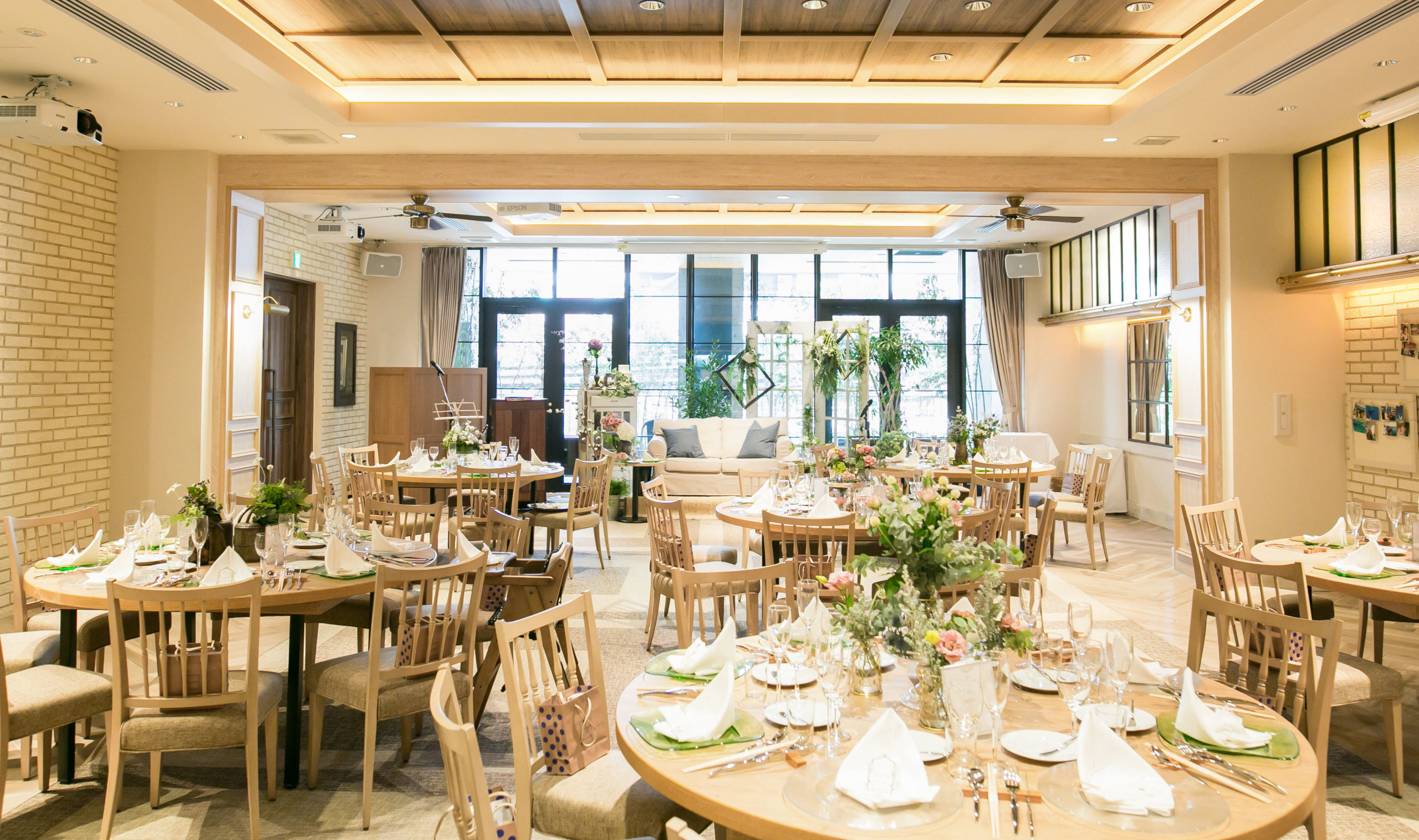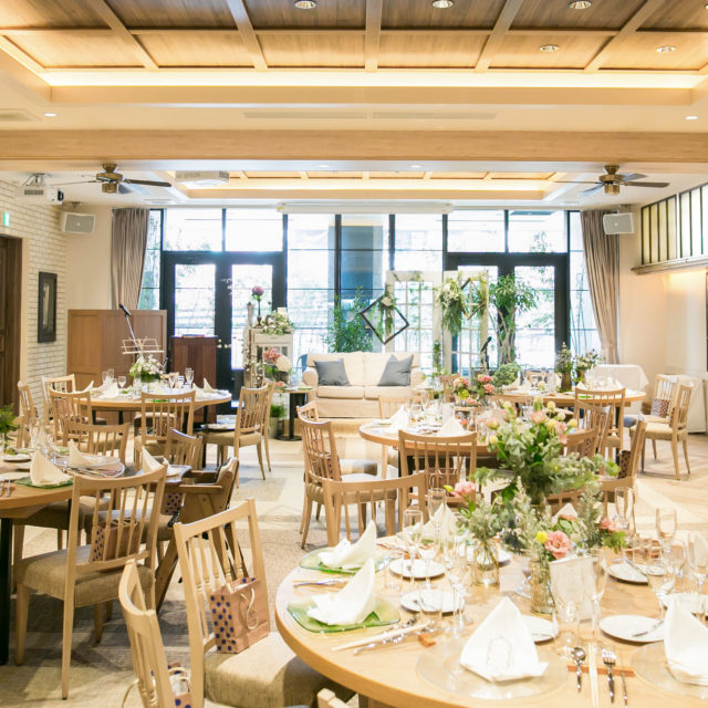 会話がはずむパーティー会場をコンセプトに、ご家族ご友人と顔を合わせながら楽しめる、木のぬくもりを感じるアットホームな空間です。