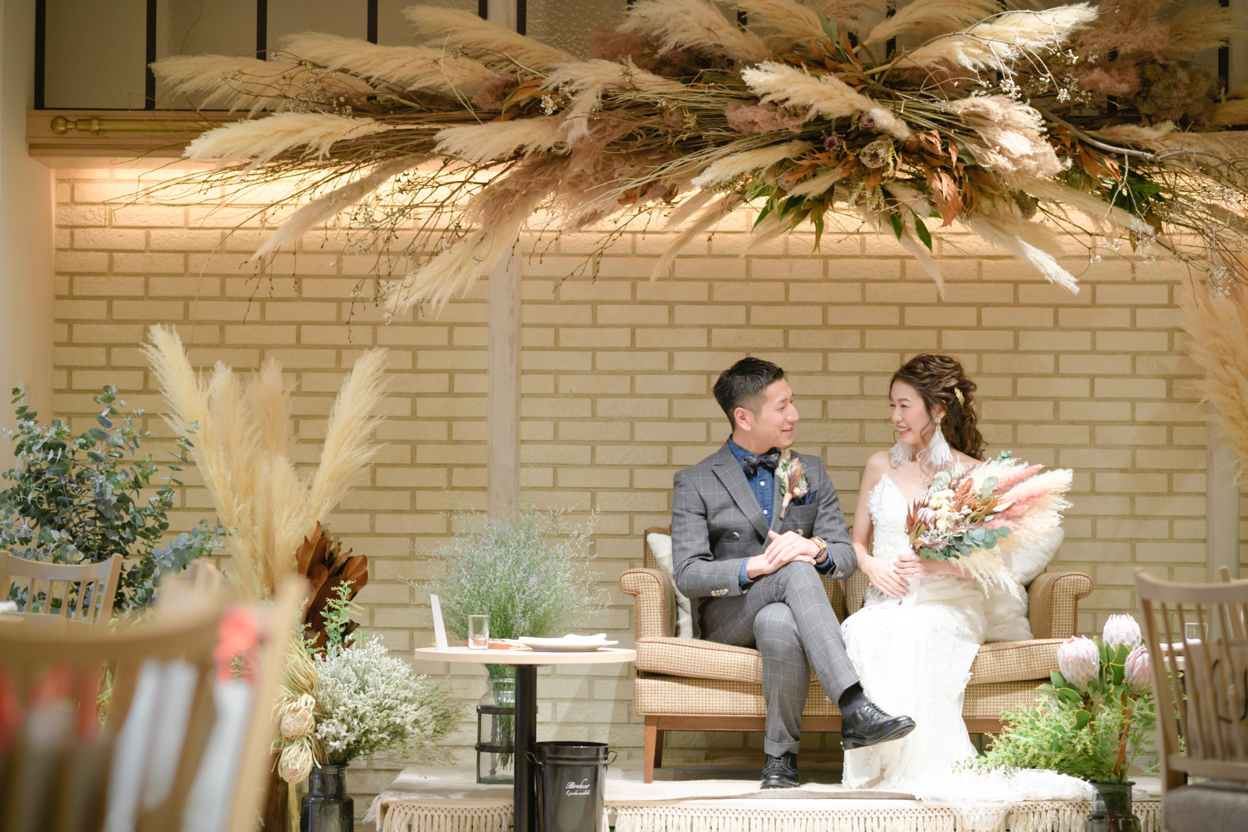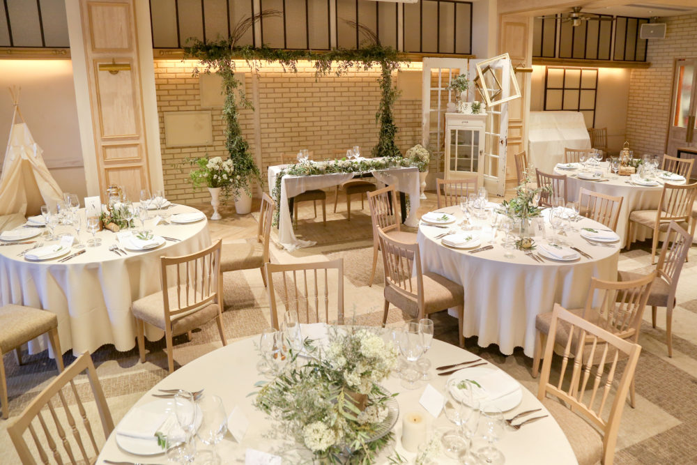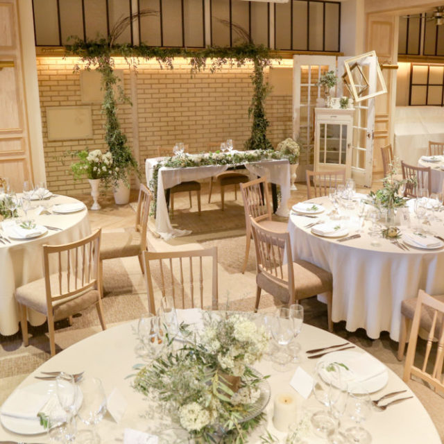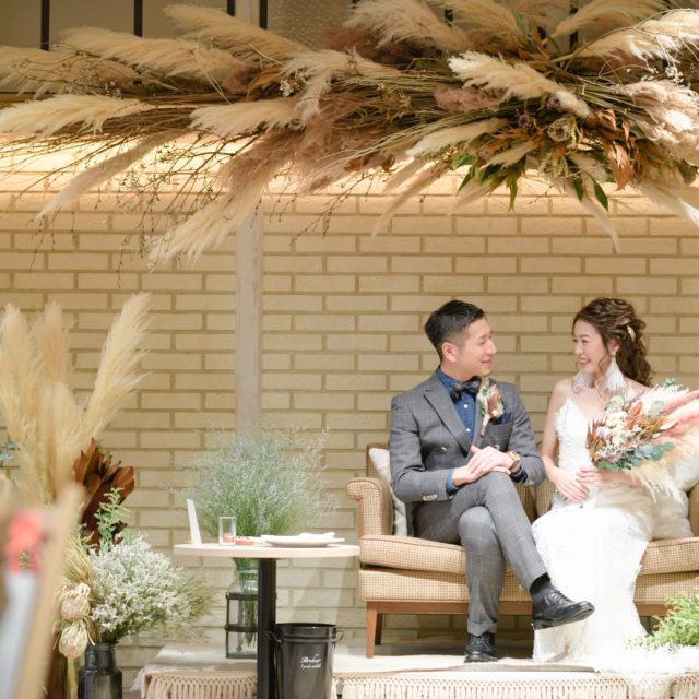 ゲストと近い距離で会話やお食事を愉しめるすっきりとしたシルエットのドレスがおすすめです。ソファ席にして足元までこだわったコーディネートも素敵です。